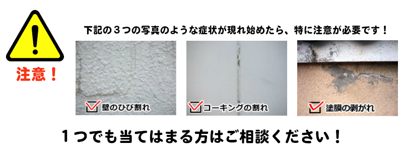 外壁塗装とは、もちろん美観を保つという目的もあります。ですが、本来は建物を防水して寿命を延ばすことが目的なのをご存知でしたでしょうか?最初にお伝えした「大事に至る」と言う事は、壁のひび割れや塗装の膜が劣化することで壁の内側に雨水が入り込み、下地の柱を腐らせてしまう、といった事態になる事です。(屋根の雨漏りは直接天井に落ちるので音やシミですぐに分かりますが、壁の雨漏りは外側のひび割れ位からしか判断する事が出来ません。)この状況に至ると材木は湿気を含み、白蟻を呼ぶ可能性もあります。さらに、いざ外壁塗装をしようと思った時に、塗装だけでは済まないこともあります。外壁塗装には、こうした雨漏りによる二次的被害の誘発を阻止する役目があります。しかし、日常生活の中で、壁の内側の状況など見れるはずもありません。そこで、外観をみれば誰でも簡単にチェックできる3つの注意ポイントをお知らせいたします。